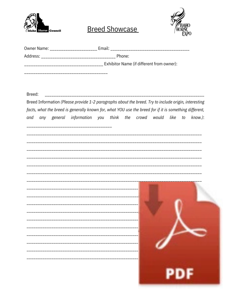 Would you like to introduce your favorite breed to the public? This is the perfect opportunity to do just that! The best part is, it’s FREE! Fill out the application and email it to: idahohorsecouncil@yahoo.com